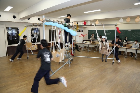 例年高2生が中心となり、生徒主体で運営をしています。今年も来校された方々に楽しんでいただけるよう、アミューズメント課のジェットコースター、メリーゴーランドのような大型企画を中心に、学年・クラス・クラブ・有志の団体が様々な企画をし、準備しました。当日は、一日中活気に満ちた行事となりました